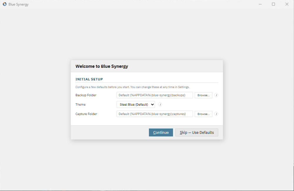When you launch Blue Synergy for the first time, a setup wizard appears before the main window. It lets you configure three defaults — everything can be changed later in Settings.